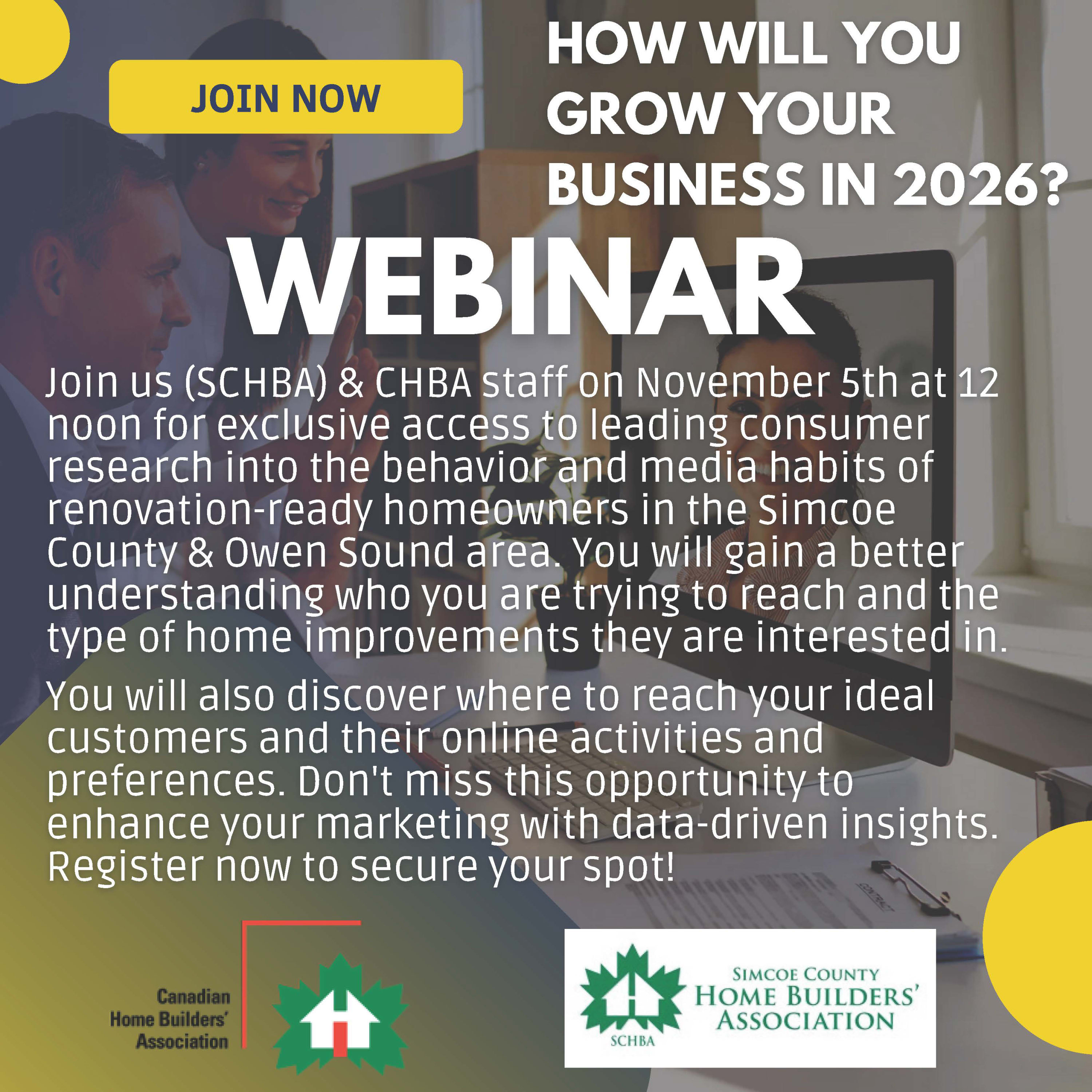 You are invited to a Vividata Webinar ** Please RSVP to Sandy if you would like your name on the list 😊 How will you grow your business in 2026? Join CHBA staff on November 5th for exclusive access to leading consumer research into the behavior and media habits of renovation-ready homeowners in the Simcoe County & Owen Sound areas. You will gain a better understanding who you are trying to reach and the type of home improvements they are interested in. You will also discover where to reach your ideal customers and their online activities and preferences. Don't miss this opportunity to enhance your marketing with data-driven insights. Register now to secure your spot!